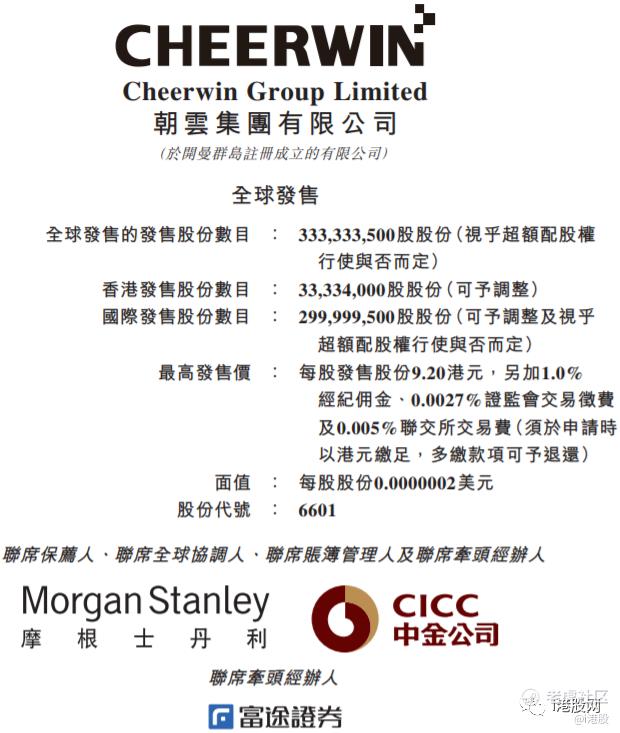朝雲集團此次IPO募資額上限30.7億港元,主要用於新產品研發及現有產品升級、促進研發中心的建設及升級、研發團隊人才招聘。全球發行3.3億股股份,公開發售佔10%,國際配售佔90%。每股發行價爲7.8港元-9.2港元,每手500股,入場費約4646.35港元。大摩和中金擔任聯席保薦人。