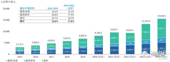 隨着家庭養寵比例的不斷上升、寵物美容及寵物醫療產業的成熟,中國寵物護理市場有望進一步擴增。2015—2019年,中國寵物護理產品市場零售額從人民幣31億增長69億,並預計2024年持續增長人民幣156億,預計2019—2024年複合年增長率爲17.8%。