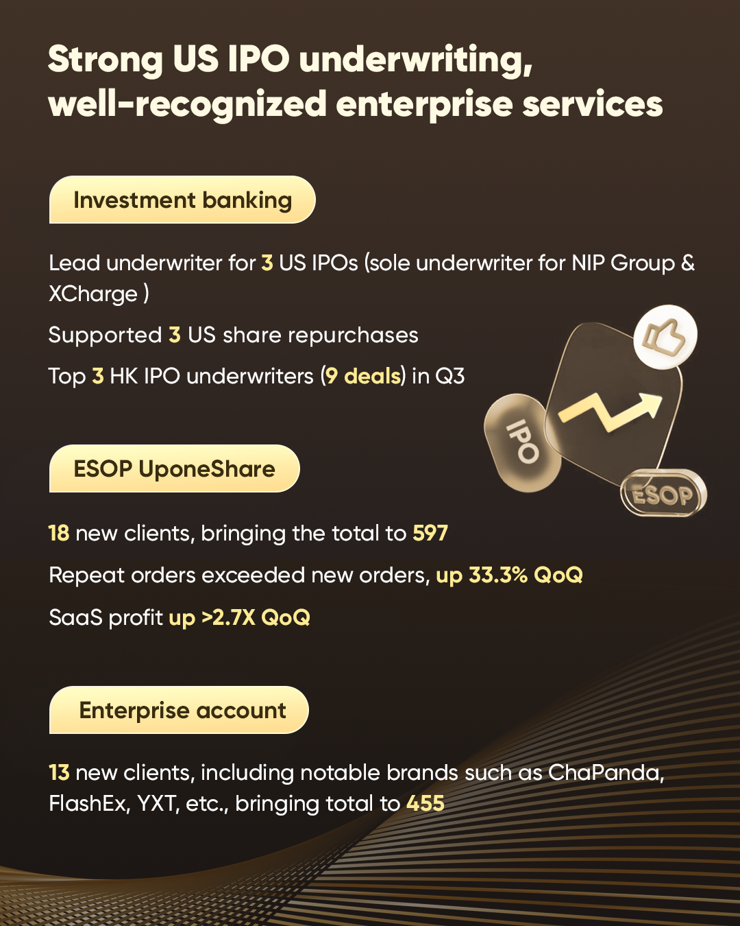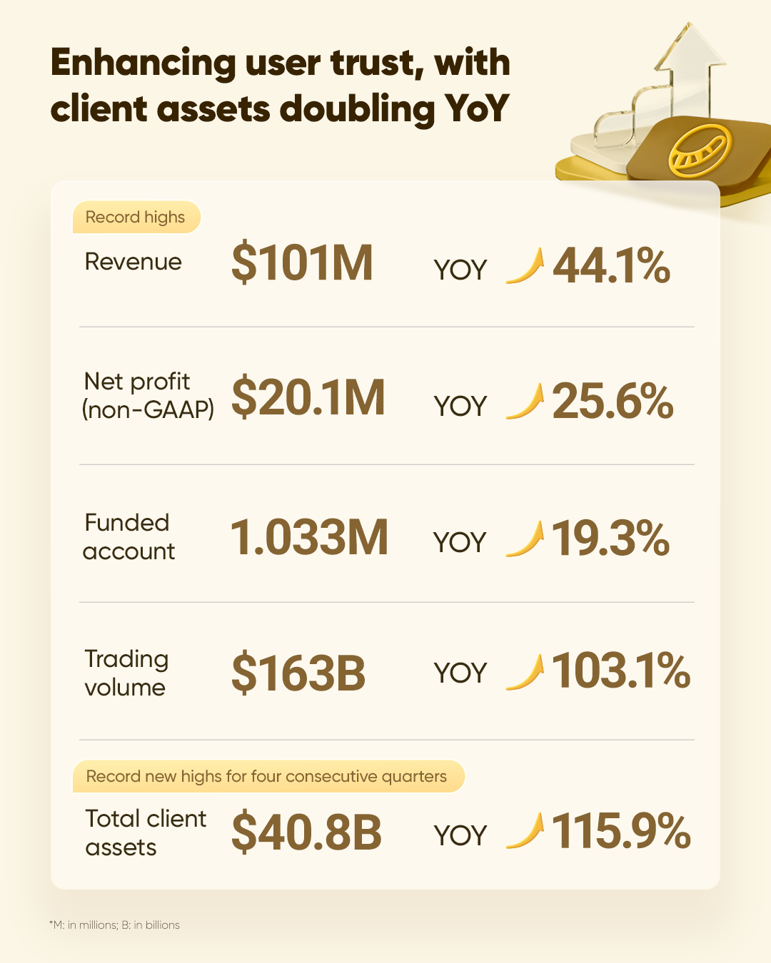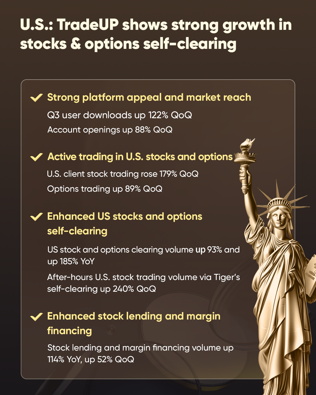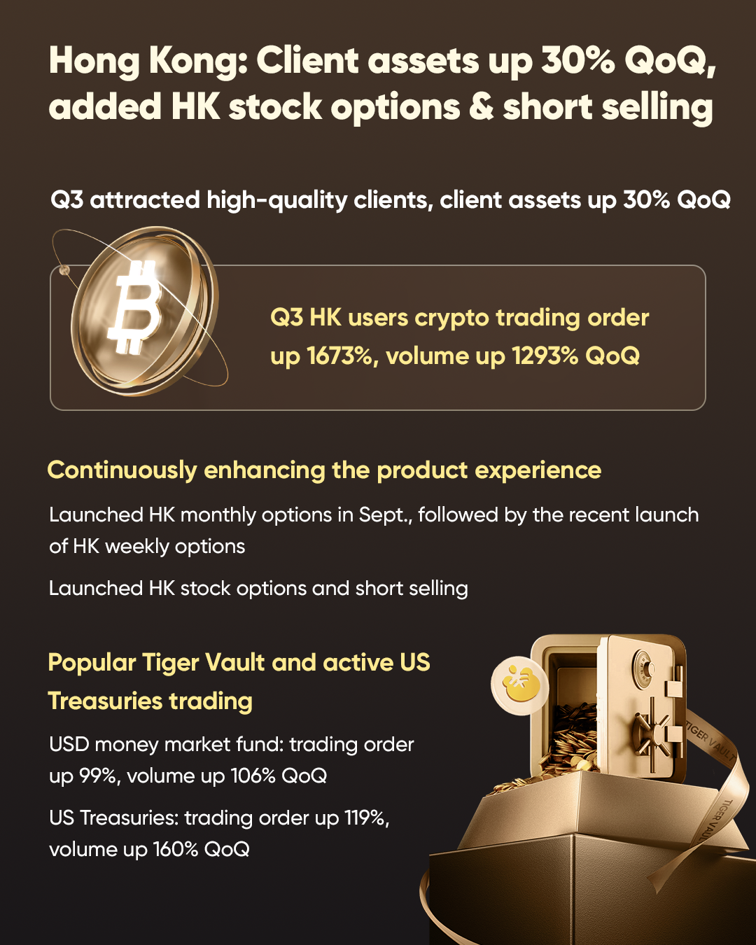 UP Fintech's founder and CEO, Wu Tianhua, stated, "In Q3, enhanced product experience drove significant business growth for the company, with revenue surpassing US$100 million—a record high—and profit reaching a three-year peak. Total client assets doubled YoY to US$40.8 billion, and the company has already achieved its annual guidance of acquiring 150,000 newly funded accounts by now. Global trading activity remained strong, with trading volume doubling YoY."