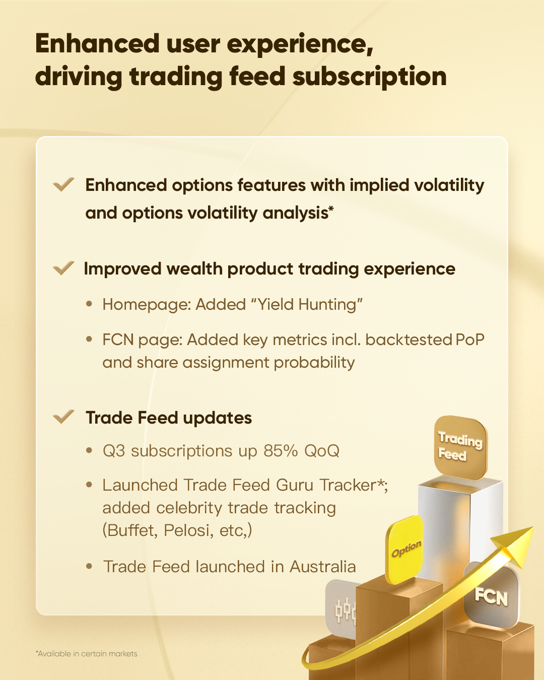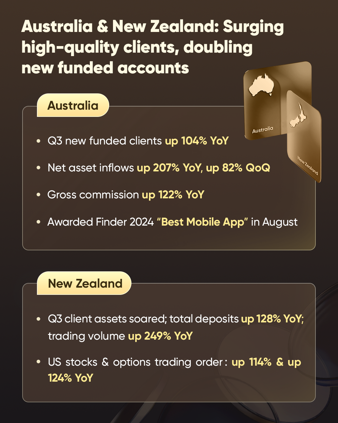 The Company added 60,000 new accounts in Q3, bringing its total global account number to 2.37 million, a 10.2% YoY increase. New funded accounts increased by 50,500, driving total funded accounts to 1,032,800, a 19.3% YoY increase. Trading volume remained robust, with total trading volume increasing 103.1% YoY to US$163 billion. Strong net deposits propelled client assets to US$40.8 billion, a 6.7% QoQ and 115.9% YoY increase, reaching a record high.