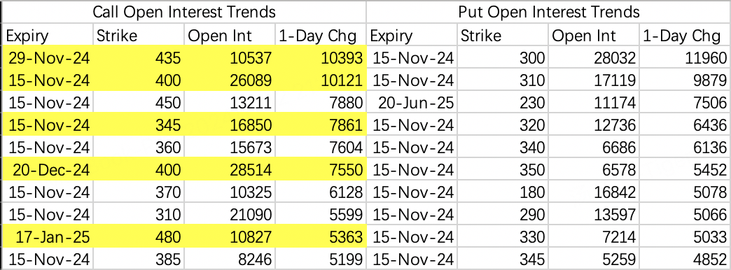 Monday's option flows in TSLA were noteworthy, with the highest opening interest in the $435 November 29th calls ($TSLA 20241129 435.0 CALL$ ).
