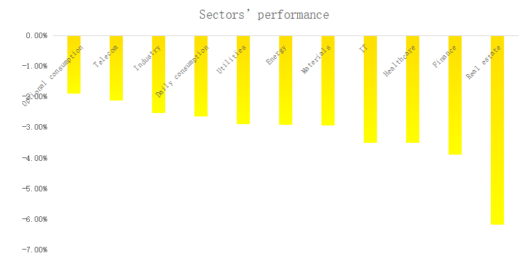 Across the board, all sectors posted losses, with real estate leading the declines.