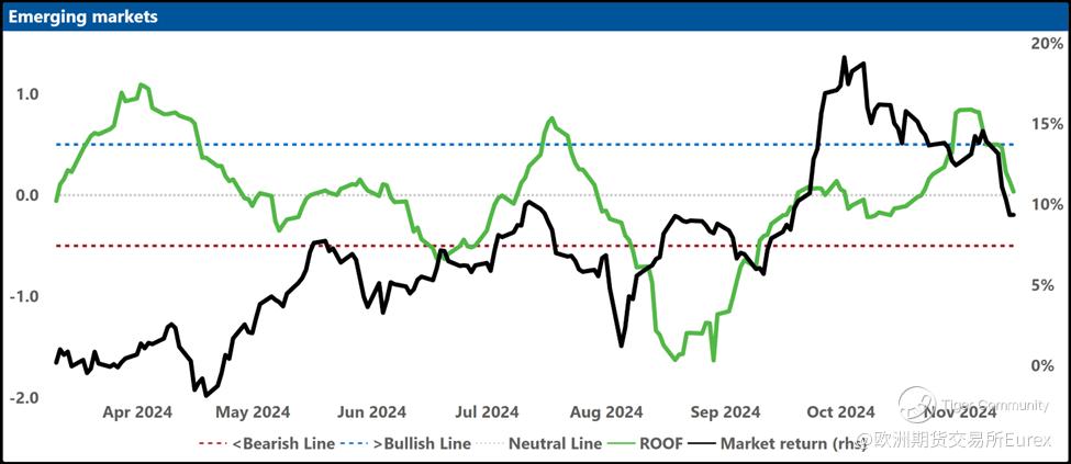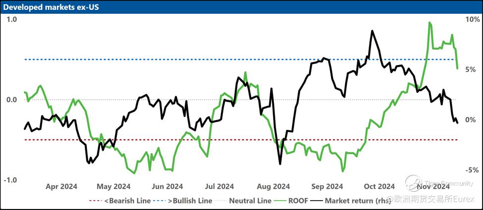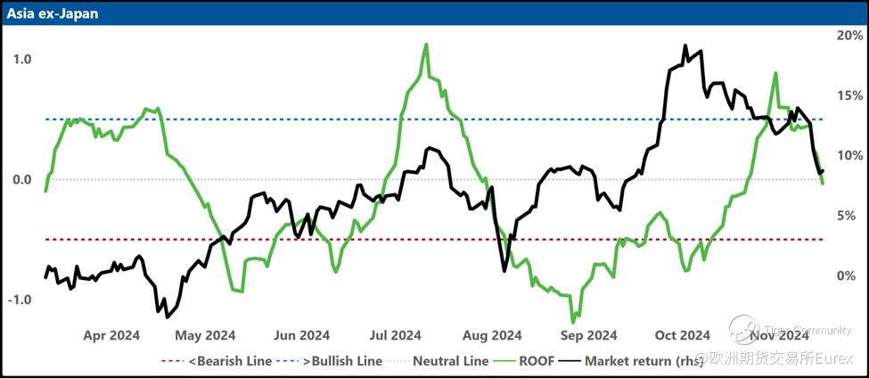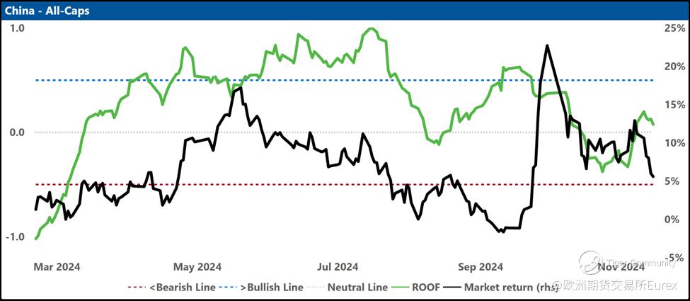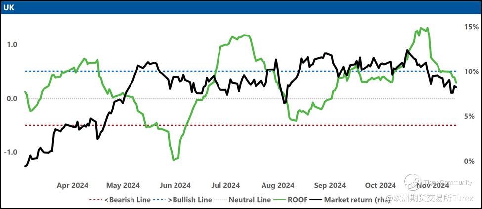 Sentiment in other markets ended the week in neutral, with only investors in the UK and Global Developed ex-US maintaining a positive outlook. In contrast, sentiment in China resumed its downward trend, weighed down by ongoing disappointment over the authorities’ latest economic stimulus efforts. The Chinese market has now lost two-thirds of its September stimulus rally, returning to levels not seen since August.