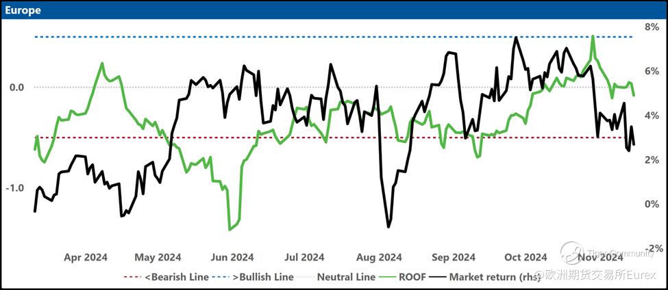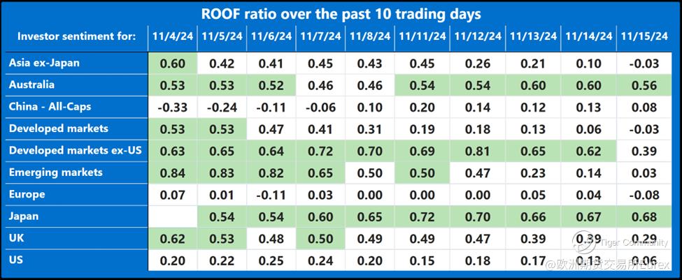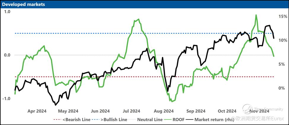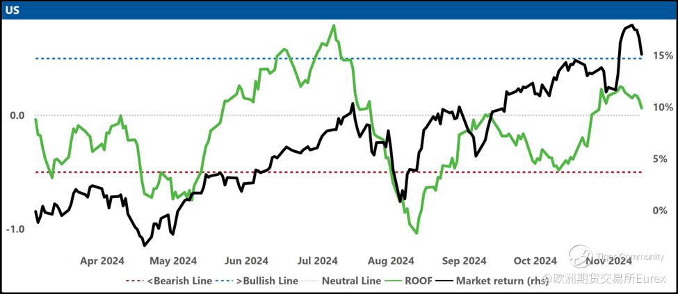 The top charts illustrate the ROOF ratio, which represents investor sentiment. This ratio is depicted in green on the left axis, while the cumulative returns of the underlying market are shown in black on the right axis. Key reference lines include: