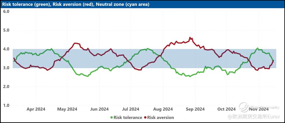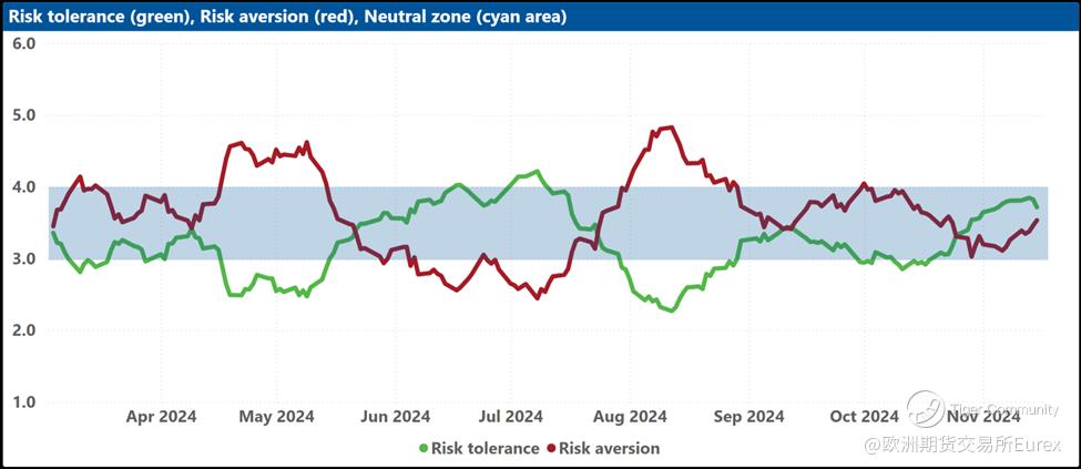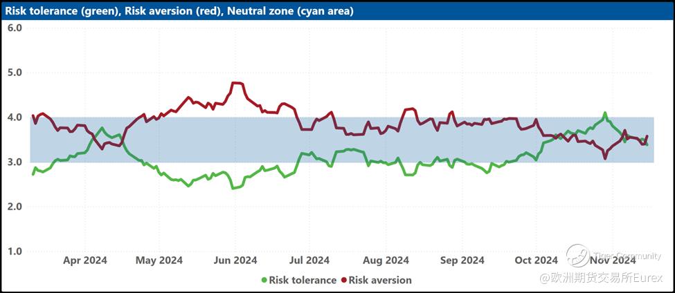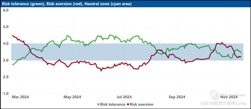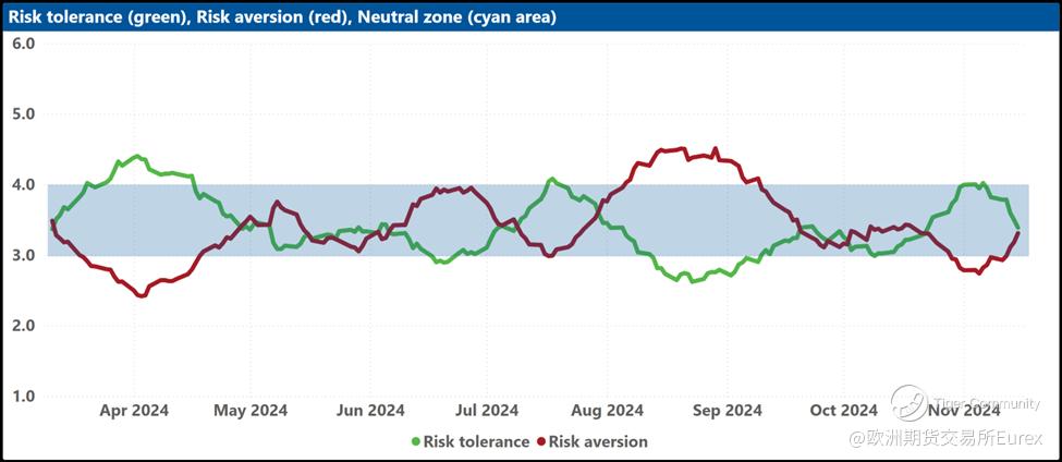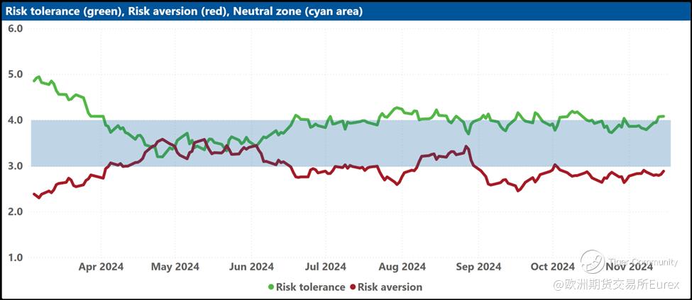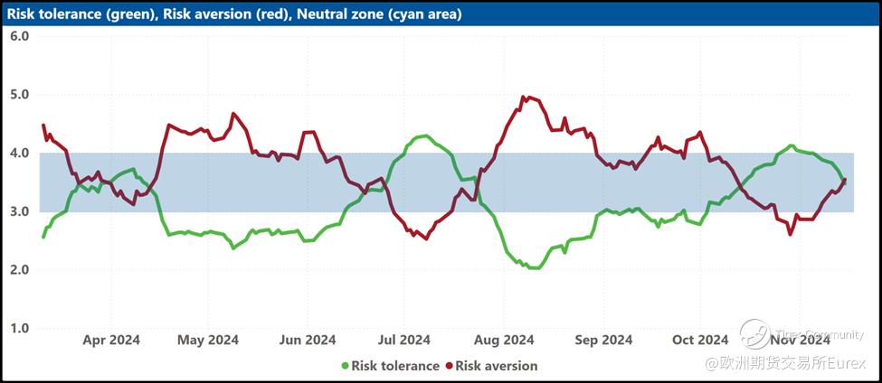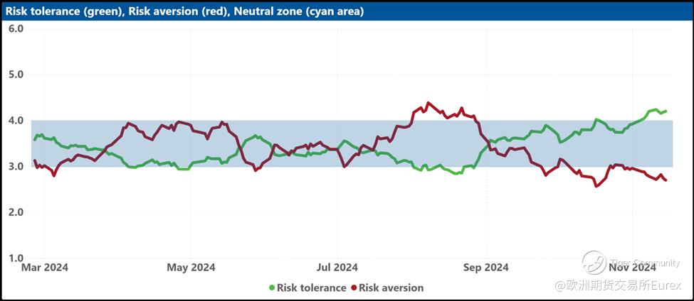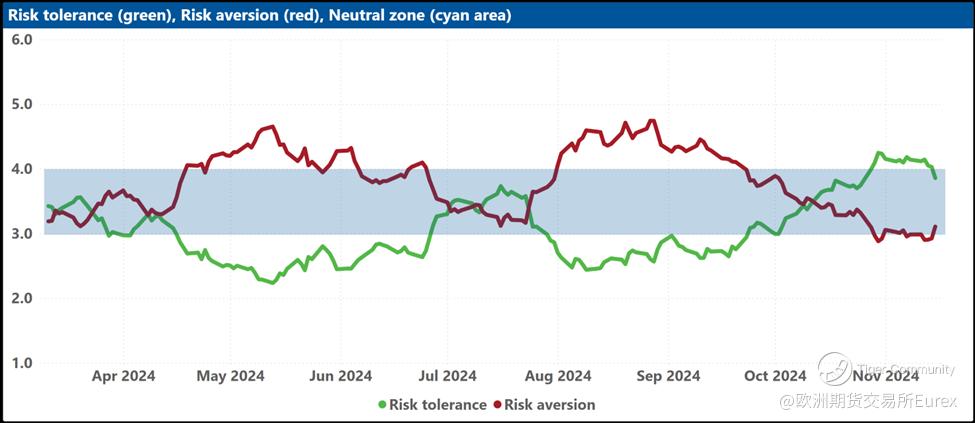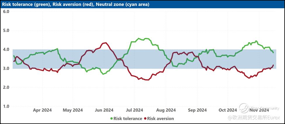 The bottom charts display the levels of risk tolerance (green line) and risk aversion (red line) within the market, representing investors' demand and supply for risk, respectively. Key insights include: