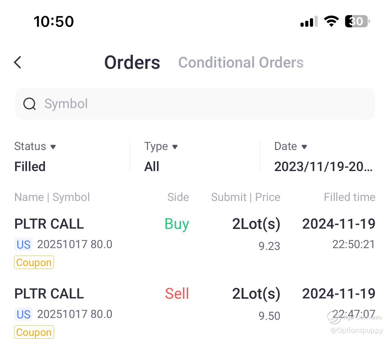 On November 19, I sold 2 PLTR call contracts at a premium of $9.50. This move capitalized on the elevated premiums due to the extended expiration and higher volatility. Shortly after, I identified an opportunity to buy back the same 2 call contracts at $9.23, locking in a quick profit of $0.27 per share (or $54 total for the two contracts).