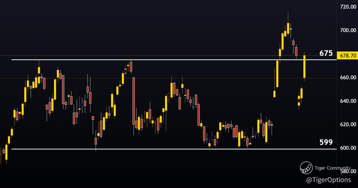 Price Action Near $599 and $675: A break below $599 with strong volume would signal bearish momentum and open the door for a short trade targeting lower levels. Conversely, a clean breakout above $675 — ideally with a strong earnings catalyst or improved guidance — would validate a bullish thesis.