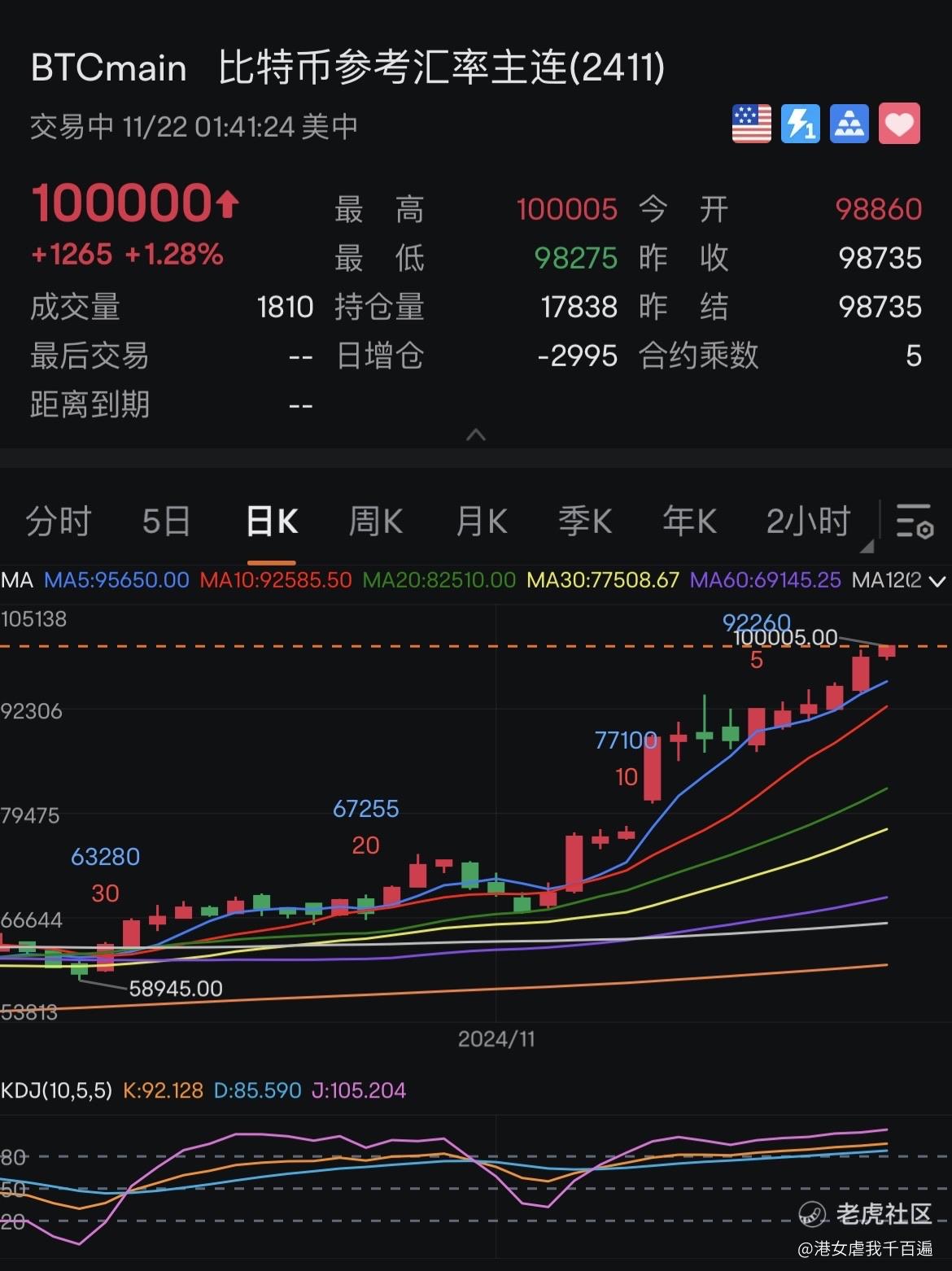 大餅繼上週站穩在9萬美元上方後,本週氣勢如虹,一路沿着5天線單邊上漲,在北京時間11月22日下午衝上10萬美元!