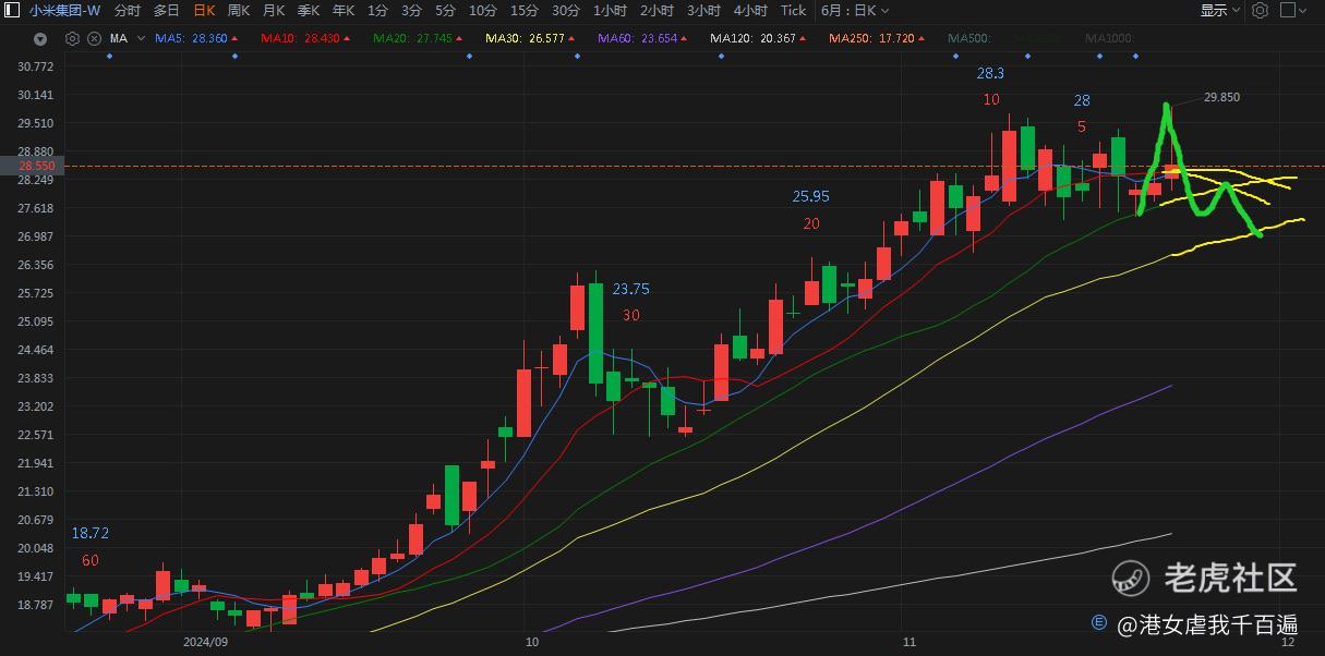 週五恆指個股普跌,只有小米仍然紅盤,但是當天下午也受到大盤拖累回落收日線長上影,它週一的財報也沒有掀起什麼波瀾,如下週再次跌破MA20(27.8左右),短線轉弱向下的概率大增。