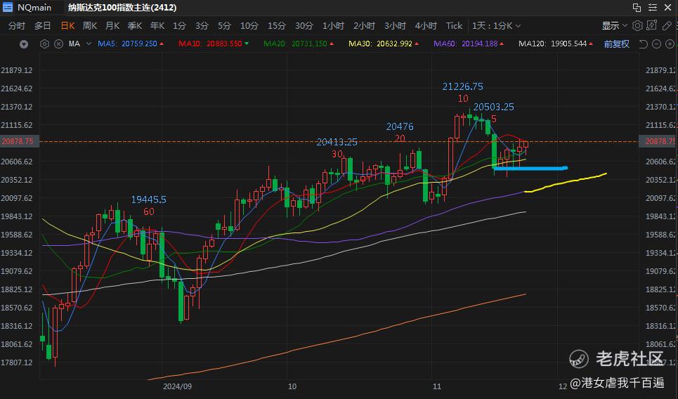 接着看看上週孱弱破位,本週繼續很拉胯的港股,恆指上週破位橫盤區間後,來到MA60附近,反彈無力再次被MA10壓下來,週五更是破底來到19200附近,恆指週五的走勢很大程度上是受到A股的影響,加上自身技術面不夠硬,跳水破位的走法似乎顯得很合理,再有一個是之前提到過的市場邏輯,特朗普的當選使得美元起碼在一段時期內都會呈現強勢,那麼強美元對應的人民幣資產走弱也是情理之中。