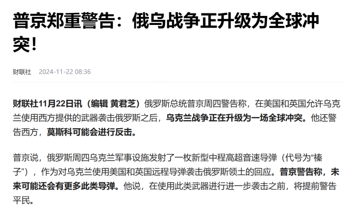 But instead,the media revealed that the U.S. government had lifted restrictions on Ukraine's use of weapons provided by the United States to attack targets in Russia in depth, then Russia updated its nuclear policy, and then the two countries began to fire missiles to each other to escalate the conflict, which dispelled the market from Russia. The idea that the Ukrainian conflict can end in a short time has renewed risk aversion in the market.