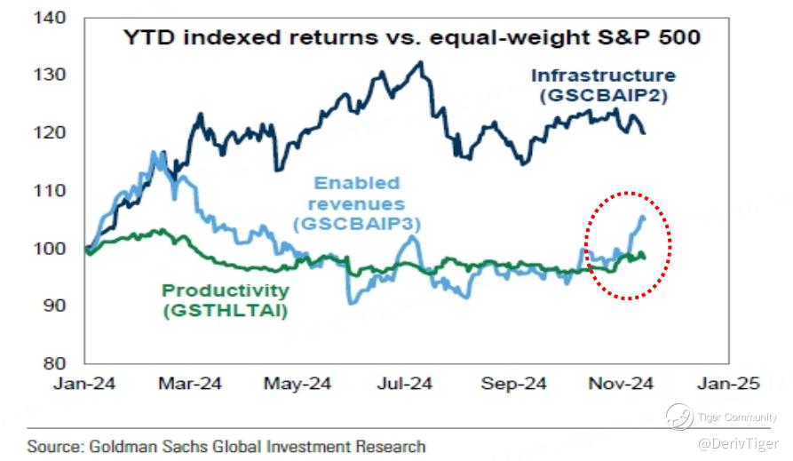 On the same day, the Q3 earnings report from Snowflake $Snowflake(SNOW)$ , a key player in AI infrastructure applications, was even more exciting. Both revenue and earnings beat expectations, with a substantial upward revision of its 2025 revenue outlook, driving a single-day stock surge of over 30%. Additionally, Goldman Sachs reported that companies linked to AI applications with revenue generation (GSCBAIP3) showed improved performance during the recent Q3 earnings season, outperforming the broader market by about 5%.