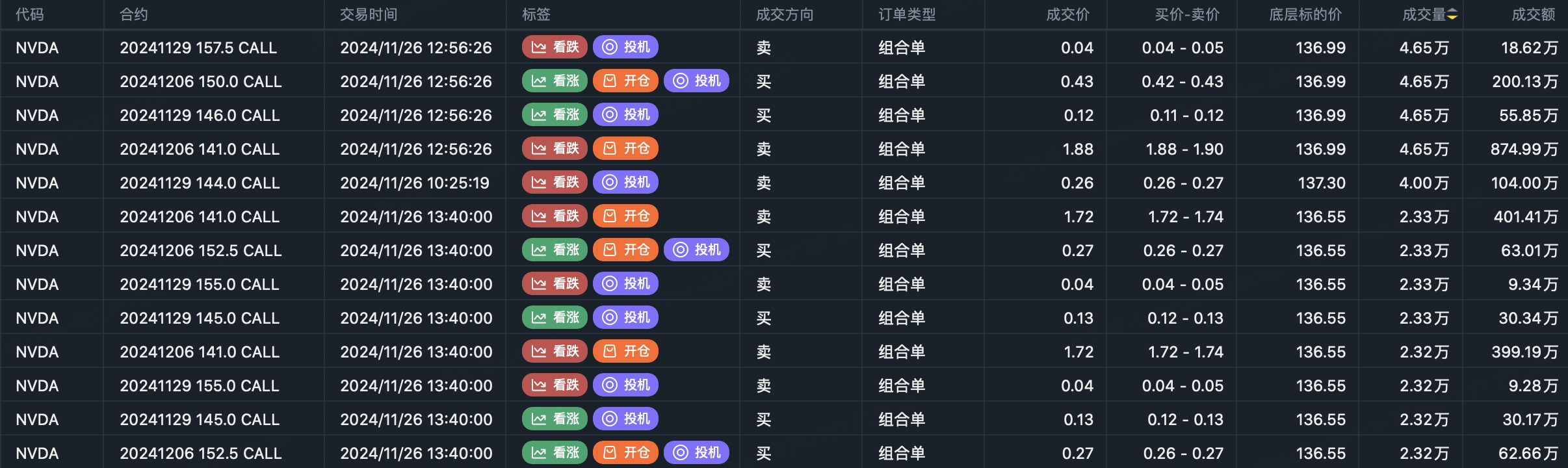 Compared to Tesla, institutions trading NVIDIA spreads are more cautious, not choosing the two-week expiration date of December 6th all at once, but rather observing for two days before rolling.