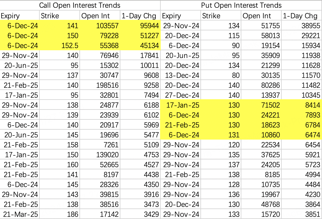 Usually, I choose their hedging leg for covered calls, which would be 150, but according to put opening data, bears have started positioning in a series of 130 puts. With NVIDIA's stock price having room for further correction, being aggressive with selling 140 calls isn't too risky.