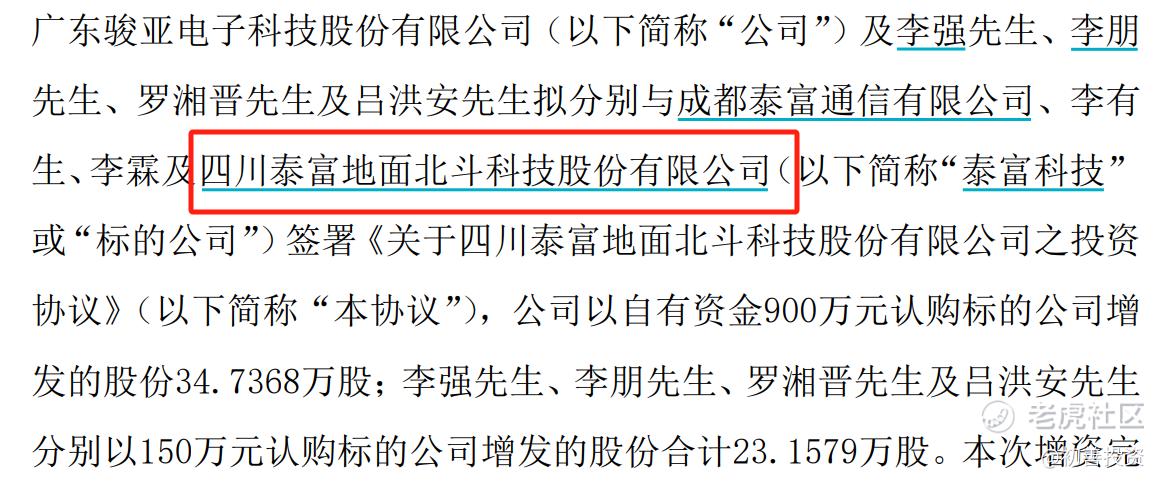 2024年7月13日,駿亞科技發佈公告,公司擬與關聯方李強、李朋、羅湘晉及呂洪安按泰富科技本次增資後估值30,000萬元對其進行增資,認購泰富科技本次新增發行股份57.8947萬股,其中公司以自有資金900萬元認購泰富科技本次增發的股份34.7368萬股公司。