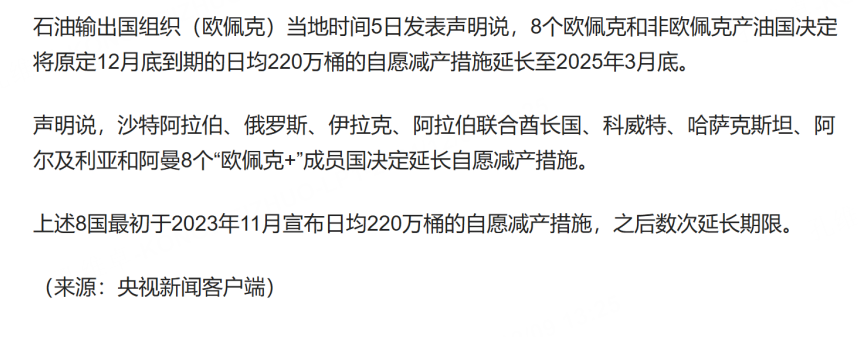 This additional voluntary production cut is shared by eight major member countries led by Saudi Arabia and Russia. It was originally scheduled to start in January 2025 and phase out the third set of "additional voluntary" production cuts of 2.2 million barrels per day within 12 months. However, due to Current oil prices, this decision will be delayed for three months.