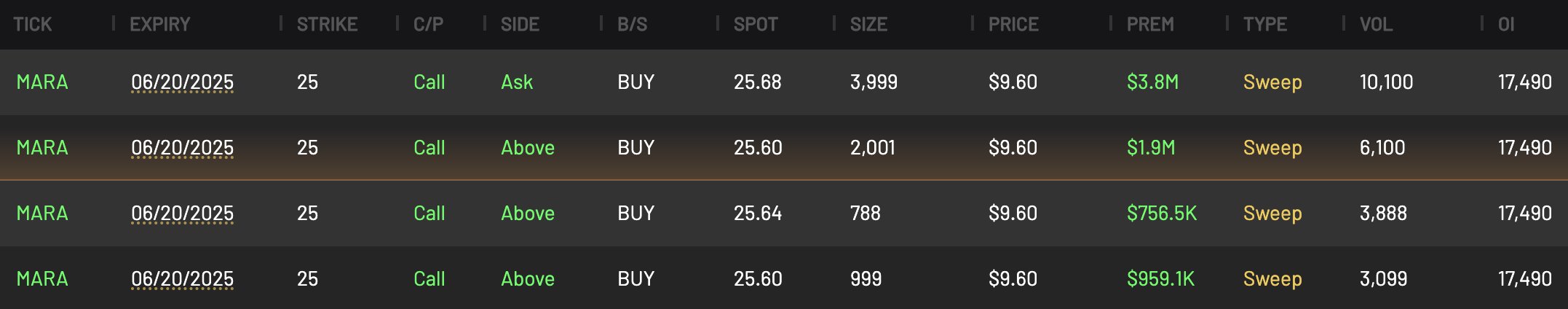 $MARA Holdings(MARA)$ Call flow coming in hot, it worth millions and this is an unusual amount of premium. What’s happening behing the scene ? 🧐🧐