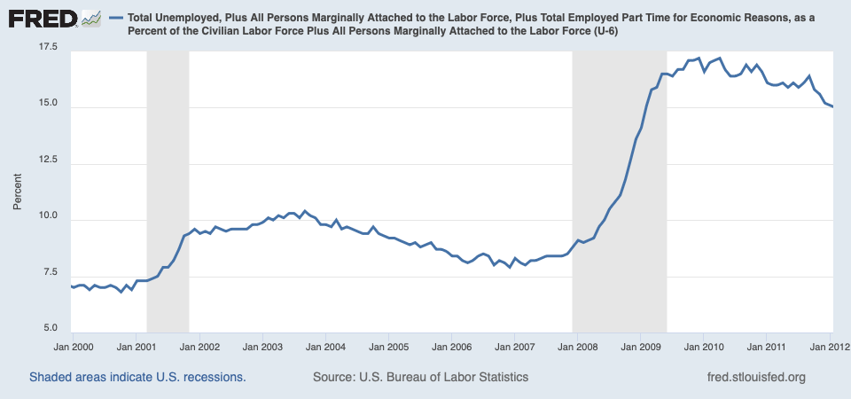 The U-6 rate includes people who are underemployed, gave up on finding work, or went back to school because they couldn’t find work. This is seen as a better gauge of the economy overall. And the rate is creeping up toward 8%.