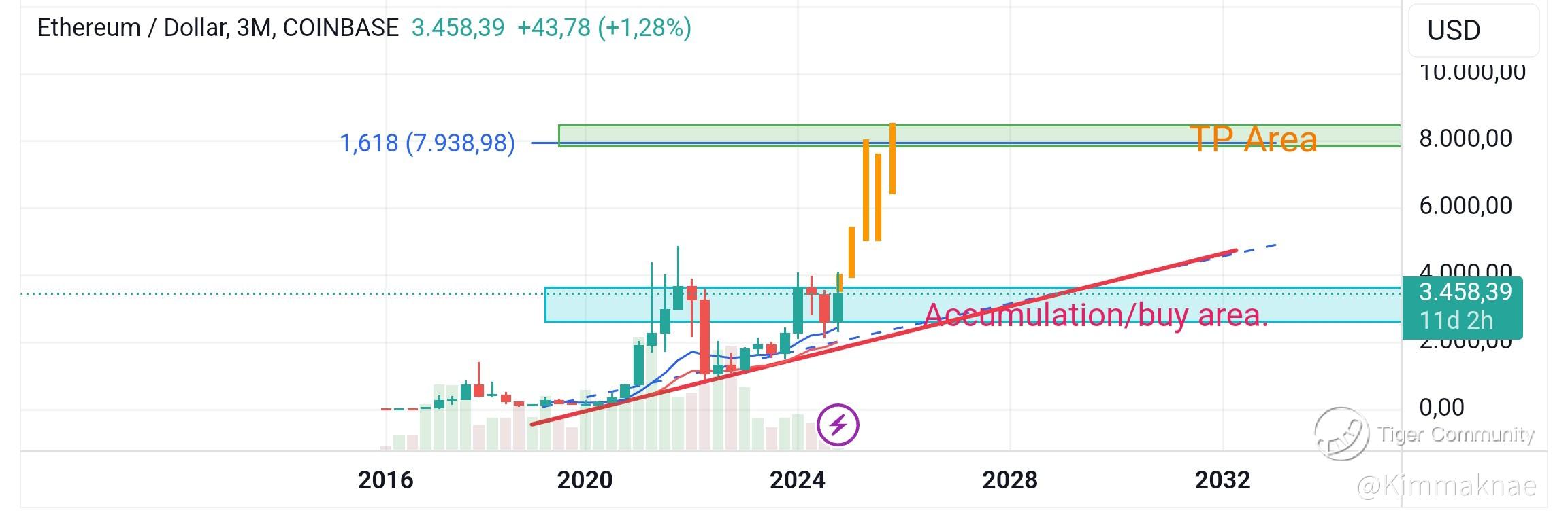 Ethereum is the No. 2 largest coin in Crypto. In early 2025 it is very very bullish. With the Narrative of ETH scalability that will occur in Q1 2025. It is estimated that $ETH will reach $8.000 In October-November 2025.Based on the news, there will be an upgrade plan on Ethereum so that it will make developments on its network.And supported by technical analysis on a 3 month time frame,Ethereum is seen forming a Free Breakout to the upside,Where is the target of fibonacci 1:1618 It is priced at $7,939.And by measuring the rise of ethereum in the past.Ethereum has experienced a similar free breakout pattern in the past. Which happened in 2020 to October 2021.When the distance range is copied on the current Ethereum chart, it is very similar.Based on the narrative of $ETH(Etherium) Very Bullish on this coin in 2025. I also included my prediction on trading view. Complete with the accumulation area available at $3.650 To $2.640.And the Profit Target is at $8,000 To $8,450.If you have a different opinion, please leave a comment.