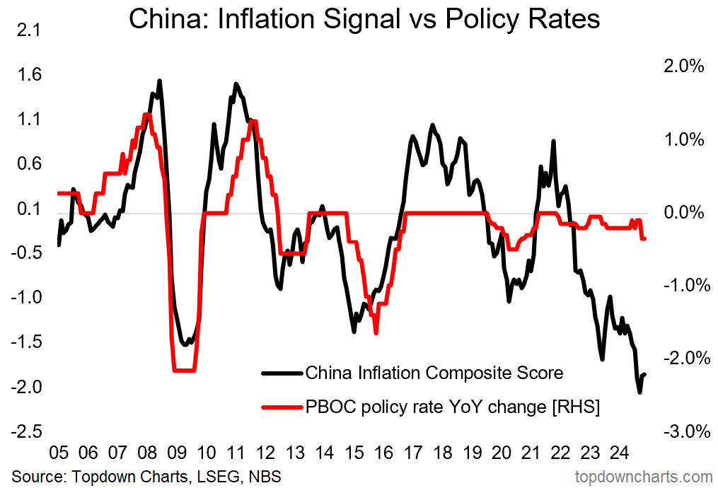 7. China Stimulus: Another key macro development in 2024 was the pivot to greater stimulus in China. The chart below flagged how the PBOC was running things much more restrictive or much less easy given the inflation pulse vs during previous downturns. In other words the door is/was wide open to further easing, rate cuts, stimulus.