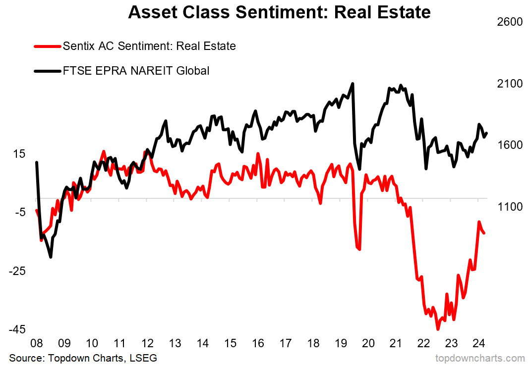 “REITs saw a much faster and significant reset in valuations (relative to housing and commercial property) and a major washout in sentiment to record pessimism (and record low allocations by investors), along with oversold technicals this created a solid setup for a rally into falling bond yields.” (12 Jan 2024)