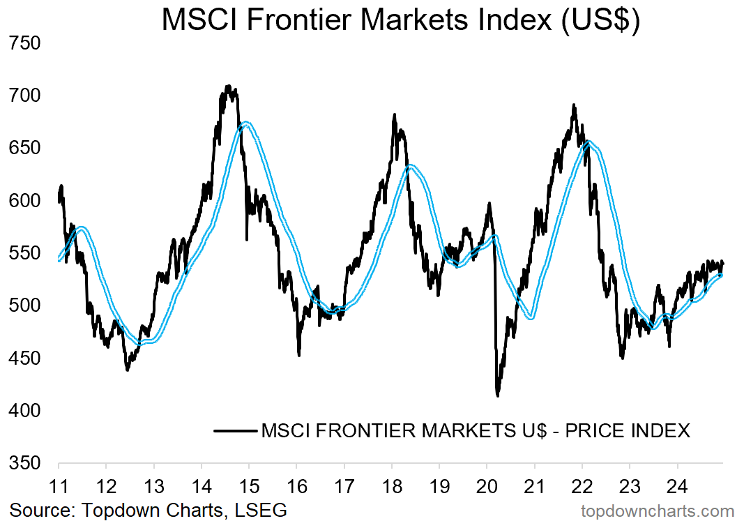 “Checking in on Frontier Market equities, the technicals have been turning up – the index tracking above its upwards sloping 200-day moving average, and country breadth indicators turning higher (indicating broadening strength across the countries within the frontier markets classification).” (26 Jan 2024)