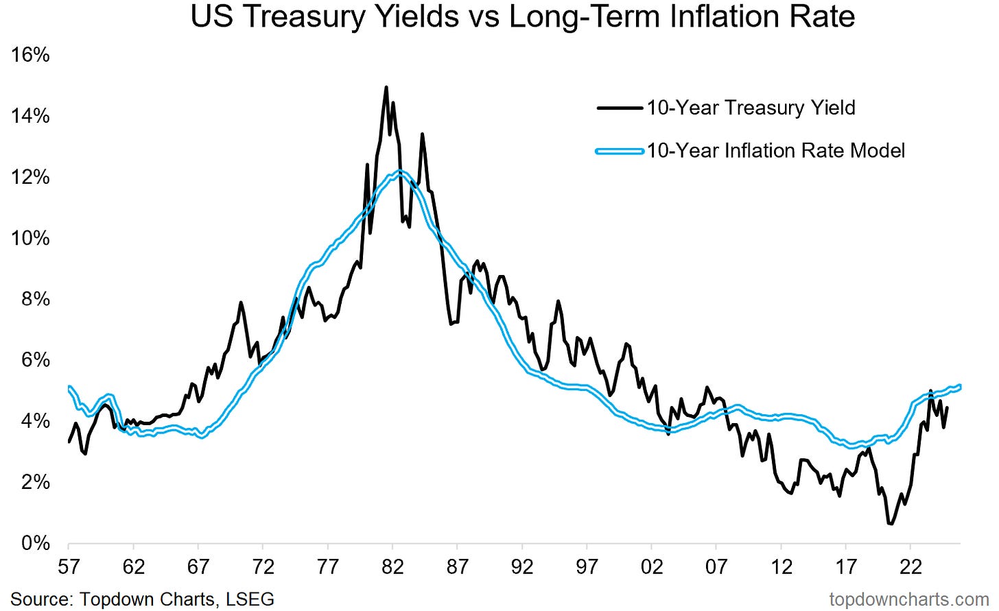 4. Higher For Longer: This chart was useful in tempering some of the bullish signs that were presenting on bonds. It was and is going to be hard for bonds to rally without a meaningful downshift in the long-term rate of inflation (which still does not seem forthcoming).