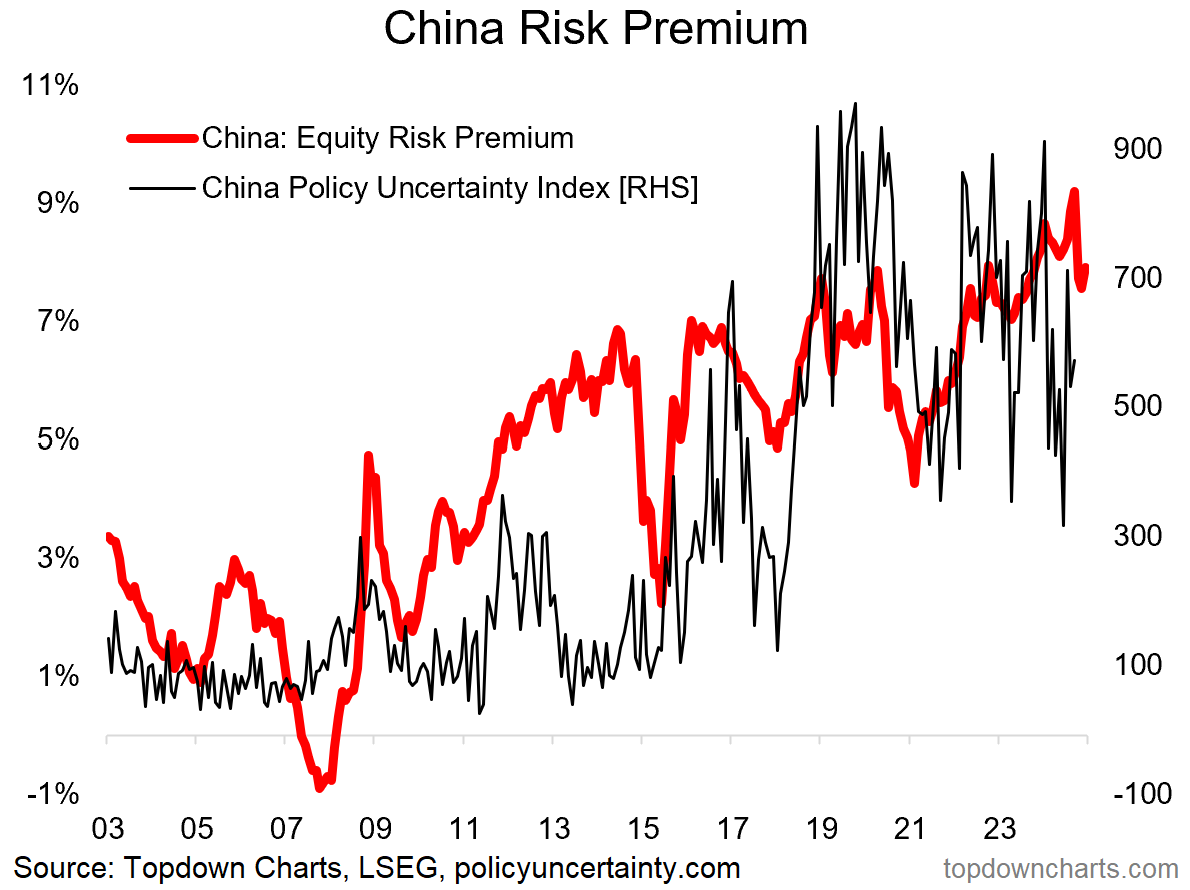 8. The China Risk Premium: This pivot to greater easing helped Chinese stocks put in a very rapid and large rally. One key ingredient to that has been the very high equity risk premium in China (“it’s in the price”).