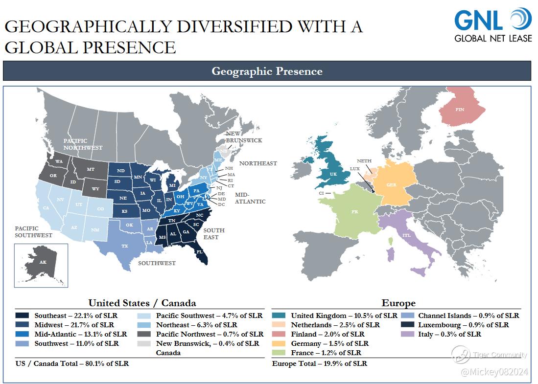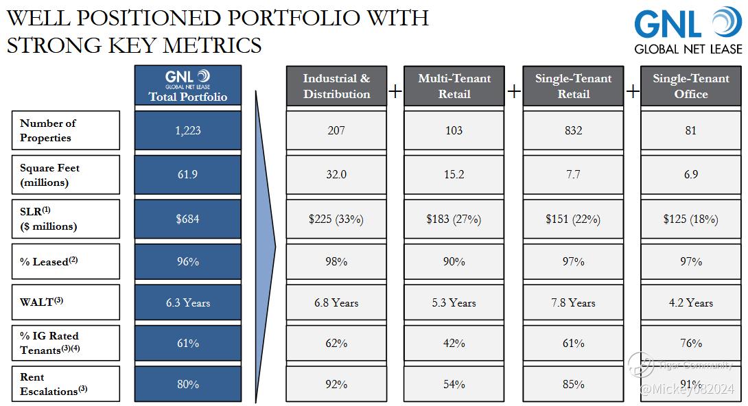 GNL owns a diversified portfolio of commercial real estate properties, primarily in the U.S. and Europe. The company emphasizes high-credit tenants and long-term leases, which are seen as less risky for steady cash flow generation. GNL has a history of acquiring properties to expand its portfolio. Recently, it has been focusing on asset dispositions to reduce debt and improve its balance sheet, part of a broader deleveraging strategy.