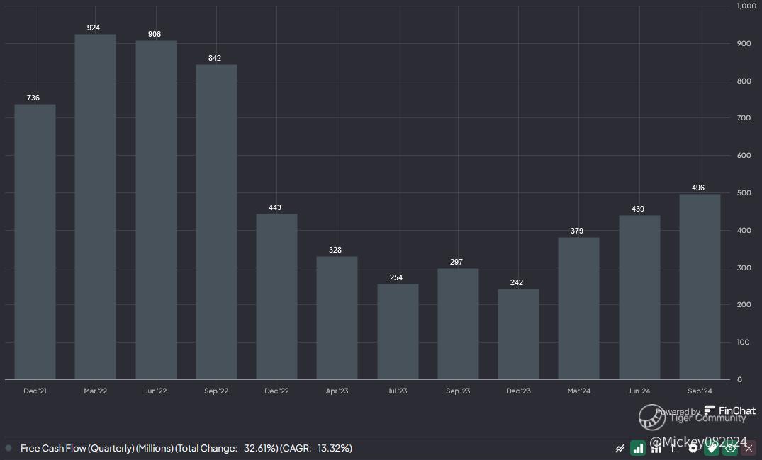 In Q3 2024, AMD reported $1.3 billion in free cash flow. This represents a solid cash generation capacity for the company, indicating strong profitability and operational efficiency despite the challenges in certain segments. Free cash flow is a critical metric, as it shows the cash available after capital expenditures, which can be used for debt reduction, dividends, or reinvestment into the business.