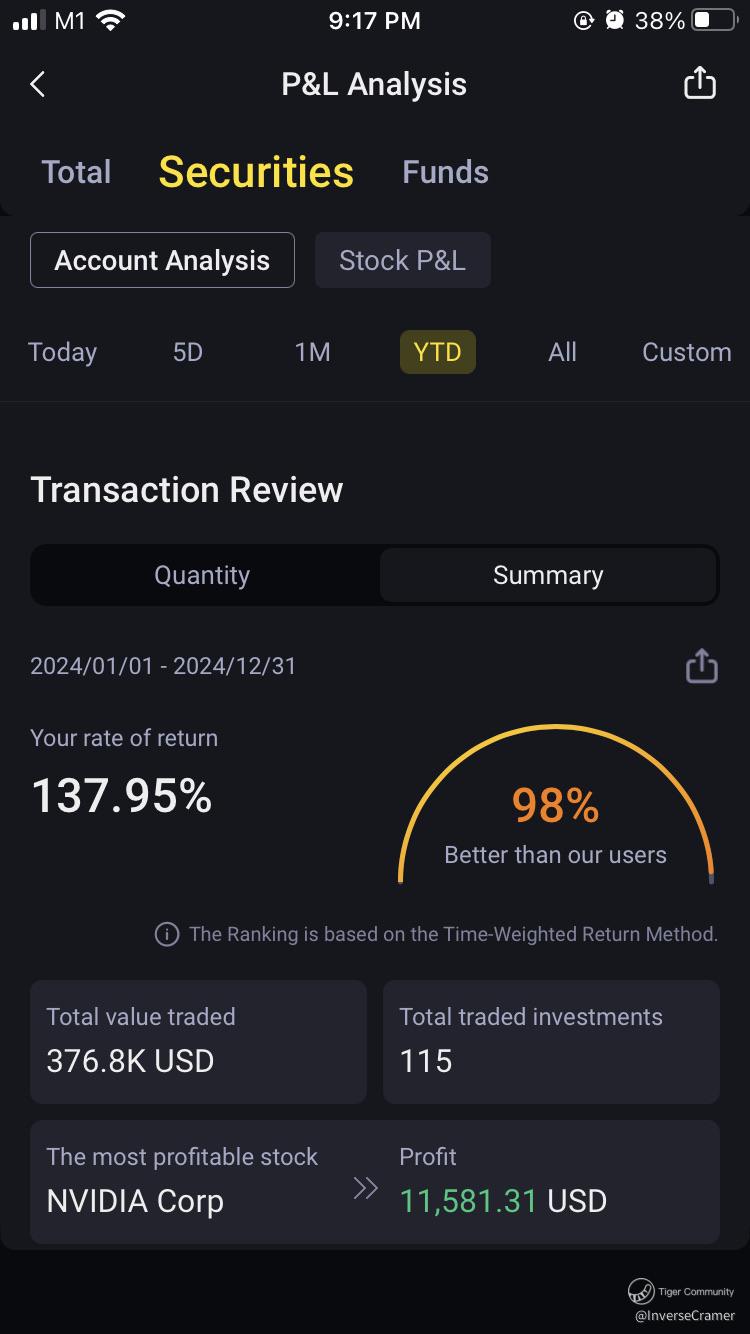 Data shows that the average retail investor return is 9.8%, clearly lagging behind the S&P 500’s impressive 23% this year. While the average retail investor’s return is only 9.8%, Tiger users seem to be doing much better. We estimate that the median return among Tiger users is likely between 15% and 20%.