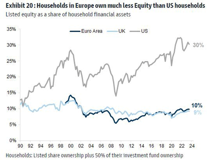 2.Equity Culture: US investors allocate 3x as much of their financial assets to equities than those in Europe/UK. Is this a culture thing? or is there something else to it…