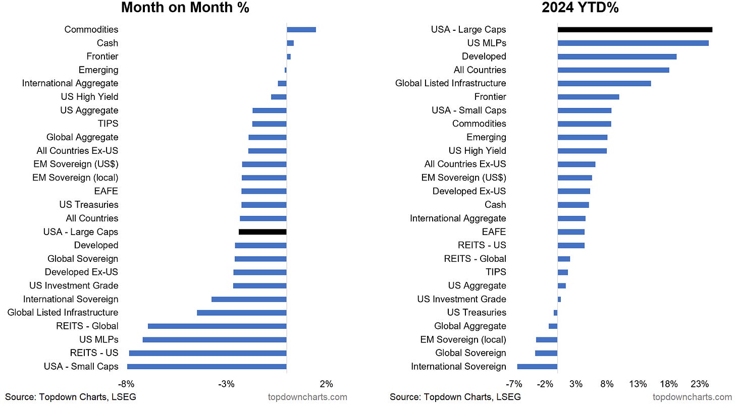 While the S&P500 (US Large Caps) lost ground on the month in December, it was at the top of the table of mainstream asset classes; well ahead of EM/Frontier/Developed equities, small caps, cash, commodities, and particularly strong vs negatively returning treasuries.
