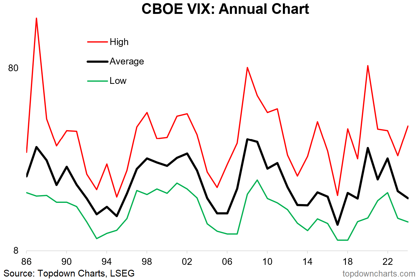 As for the $Cboe Volatility Index(VIX)$ , despite a significant but short-lived flare-up in early-August (following the BOJ rate hike and 25% crash in Japanese stocks), the average closing VIX value during the year was lower in 2024 vs 2023 — and continued the clearly cyclical trend of calming. Eventually this cycle will turn back up again, but for now we are moving further through the calming phase.