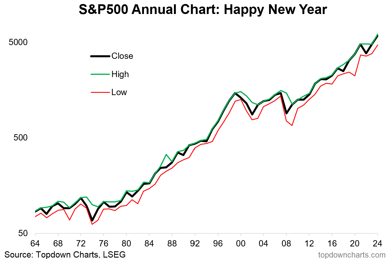 The S&P500 closed 2024 up a solid 23.3% for the year (25% including dividends). The equal-weighted version closed up a still respectable but much lower 10.9% (13% including dividends). As the annual chart below shows, the S&P500 closed a touch below the year’s daily closing high, and comfortably above the year’s low.