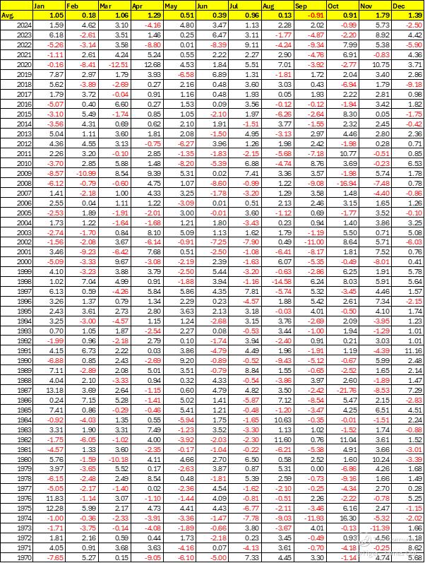 Since 1970, the $.SPX(.SPX)$ has provided a positive return 58% of the time in January. The 50-year average return in January is 1.05%.