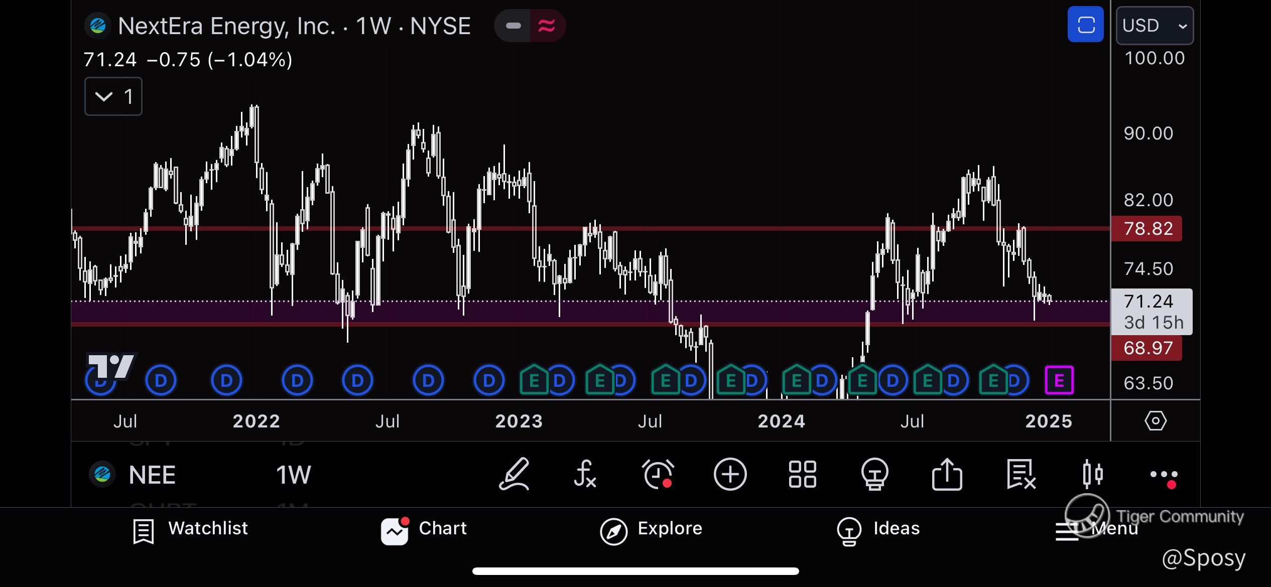 NEE closed at $71.24 yesterday, currently trading at a huge support zone of $69-$71.