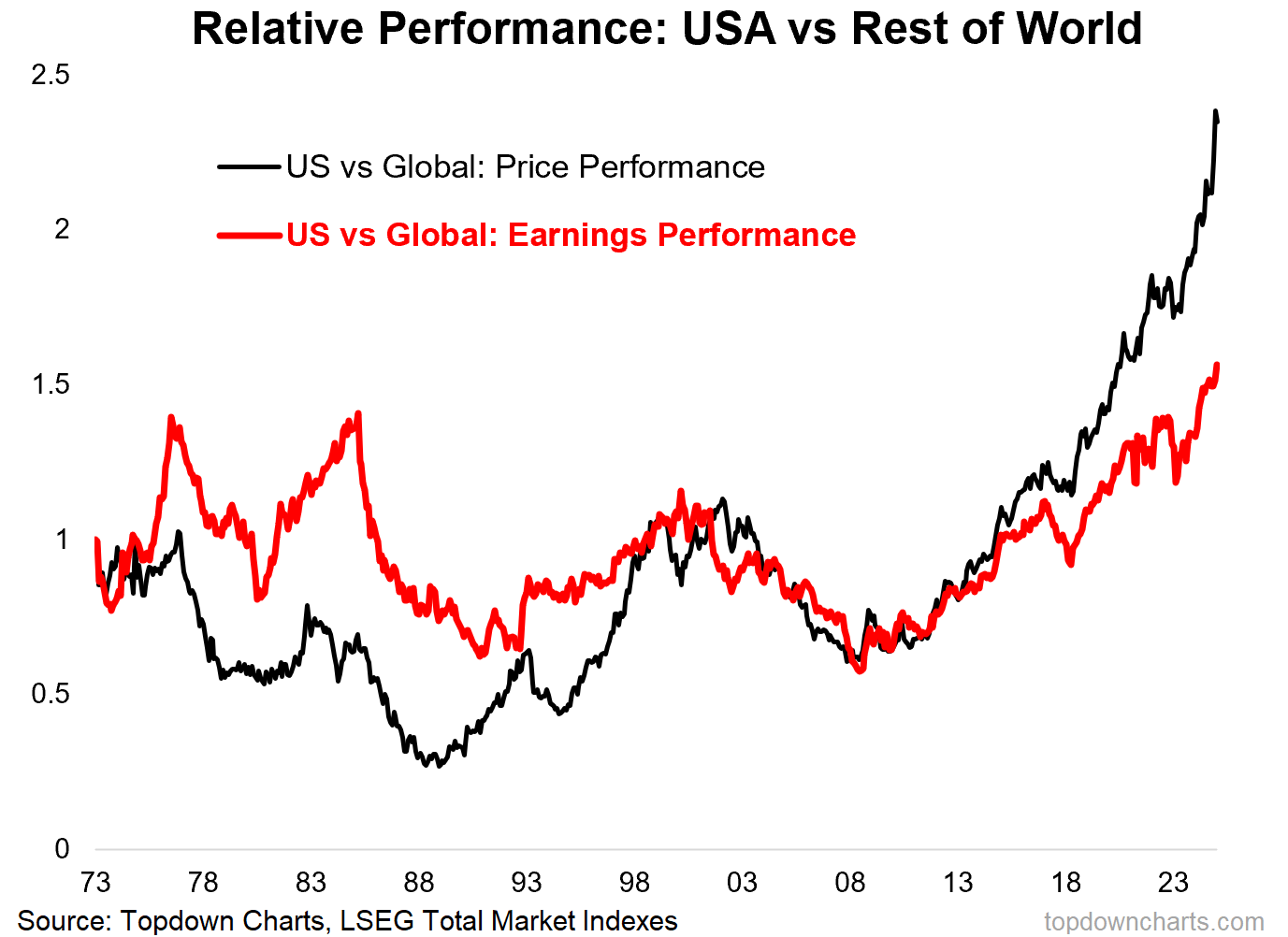 Yes US stock prices have significantly outperformed vs global stocks, but US earnings have also significantly outperformed vs global (the red line).