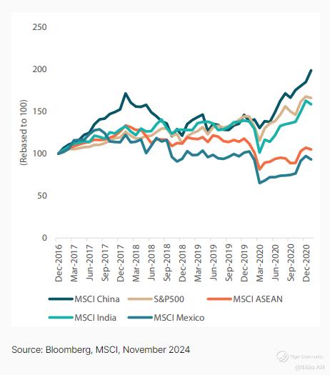 We would like to emphasise, however, that it is far from certain whether “Trump 2.0” will have a net negative impact on emerging and Asian markets. During Trump’s first term (January 2017-January 2021), China outperformed both the Standard and Poor's 500 (S&P 500) [ 2 ] and all the perceived “China plus one [ 3 ] ” beneficiaries (Chart 2).