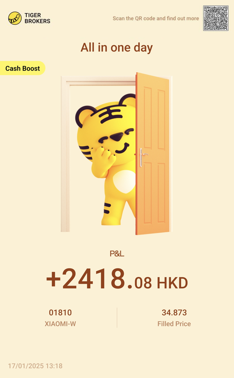 On 17 January, @NathanEsther made a huge profit of HKD 2418 in one day by buying $XIAOMI-W(01810)$ with a Cash Boost Account. @NathanEsther had confidence in Xiaomi's EV business and the market's reaction also proved the correctness of that.