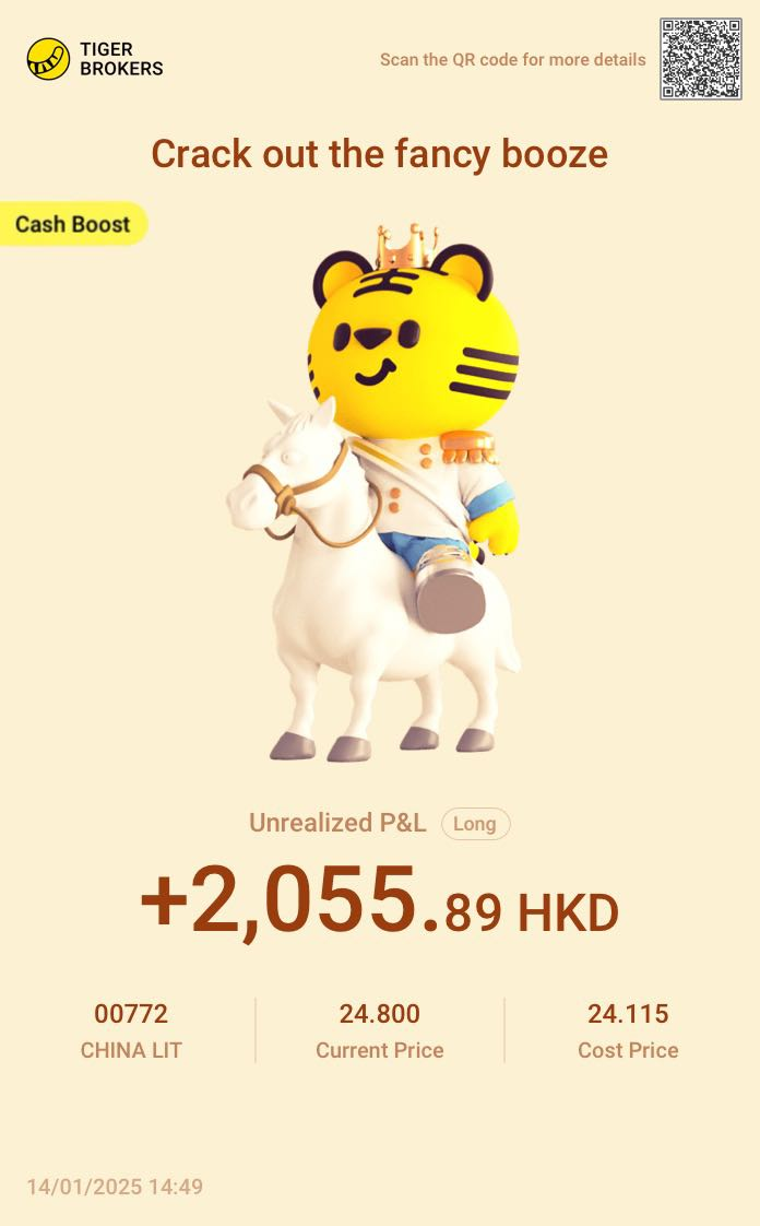 On 14 January, @ChristKitto earned over HKD 2000 in one day by buying $CHINA LIT(00772)$ with a Cash Boost Account. @ChristKitto believed the stock is climbing and the future of AI products.
