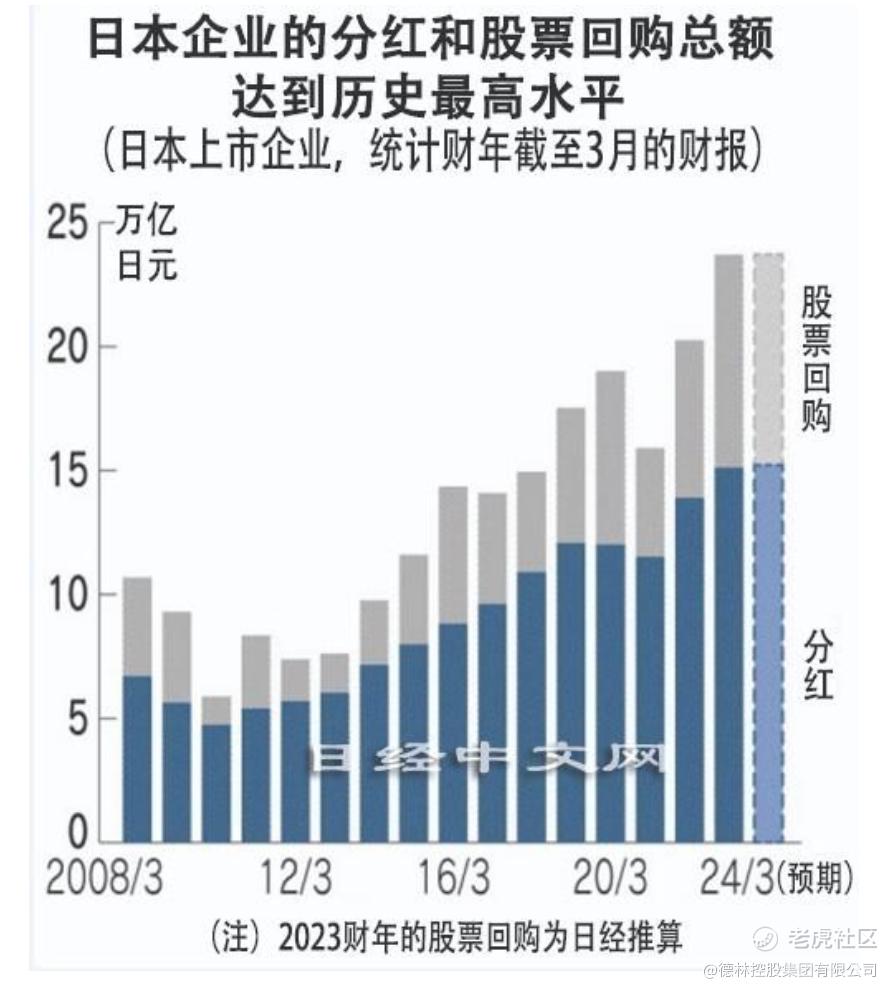 巴菲特在日本以0.25%的成本發債,買日本高分紅的股票,獲得14%的收益,在此示範效應下,海外投資人大幅度在日本發行日元債——2024年海外投資者在日本發債規模爲754億美元,同比增長9.6%。他們發債並且投資日本股市,這才導致日本股市上漲,再加上在監管多年倡導“提高股東回報”,千餘家上市公司在2024年提交了總額高達16.81萬億日元(約合1080億美元)的回購計劃。