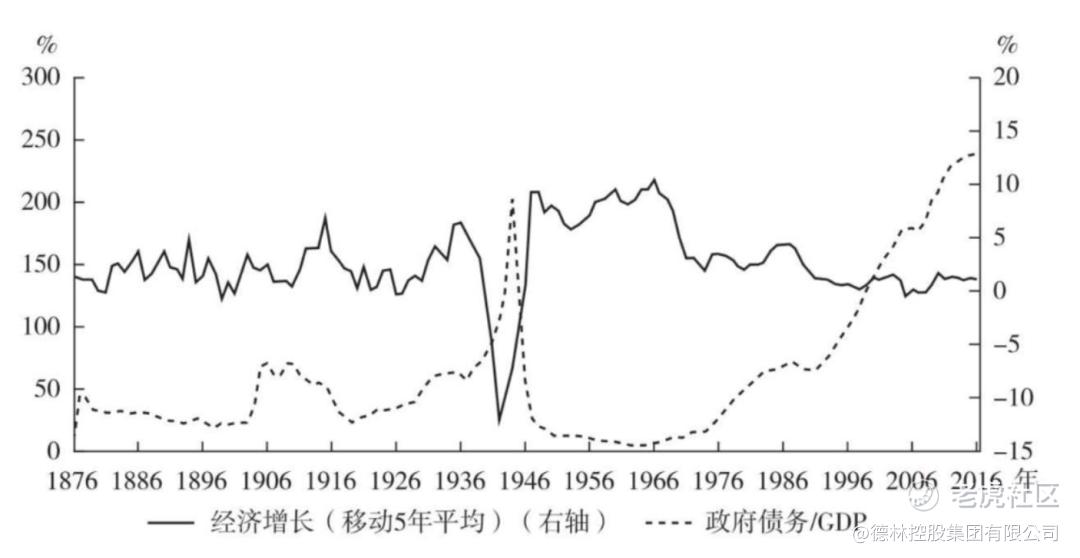下圖展示了日本1876年至2016年政府債務和經濟增長的情況。第二次世界大戰後的1945年,政府債務/GDP由1944年的204%下降至56%,戰後二十多年,日本政府債務/GDP穩定在10%左右,同時日本經濟持續快速增長。1976年以後,政府債務/GDP快速上升,日本經濟增速回落到5%以下,並出現負增長。