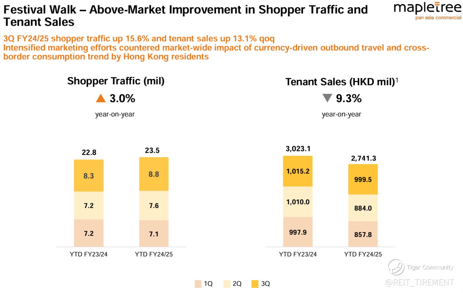 Shopper traffic rose 0.4% YoY, though tenant sales dipped 2.8% due to ongoing AEI disruptions. However, sales rebounded 14.4% QoQ, reflecting encouraging growth. At Festival Walk in Hong Kong, traffic increased by 3.0% YoY, but sales fell 9.3%. This decline was attributed to the impact of currency-driven outbound travel and cross-border consumption trends