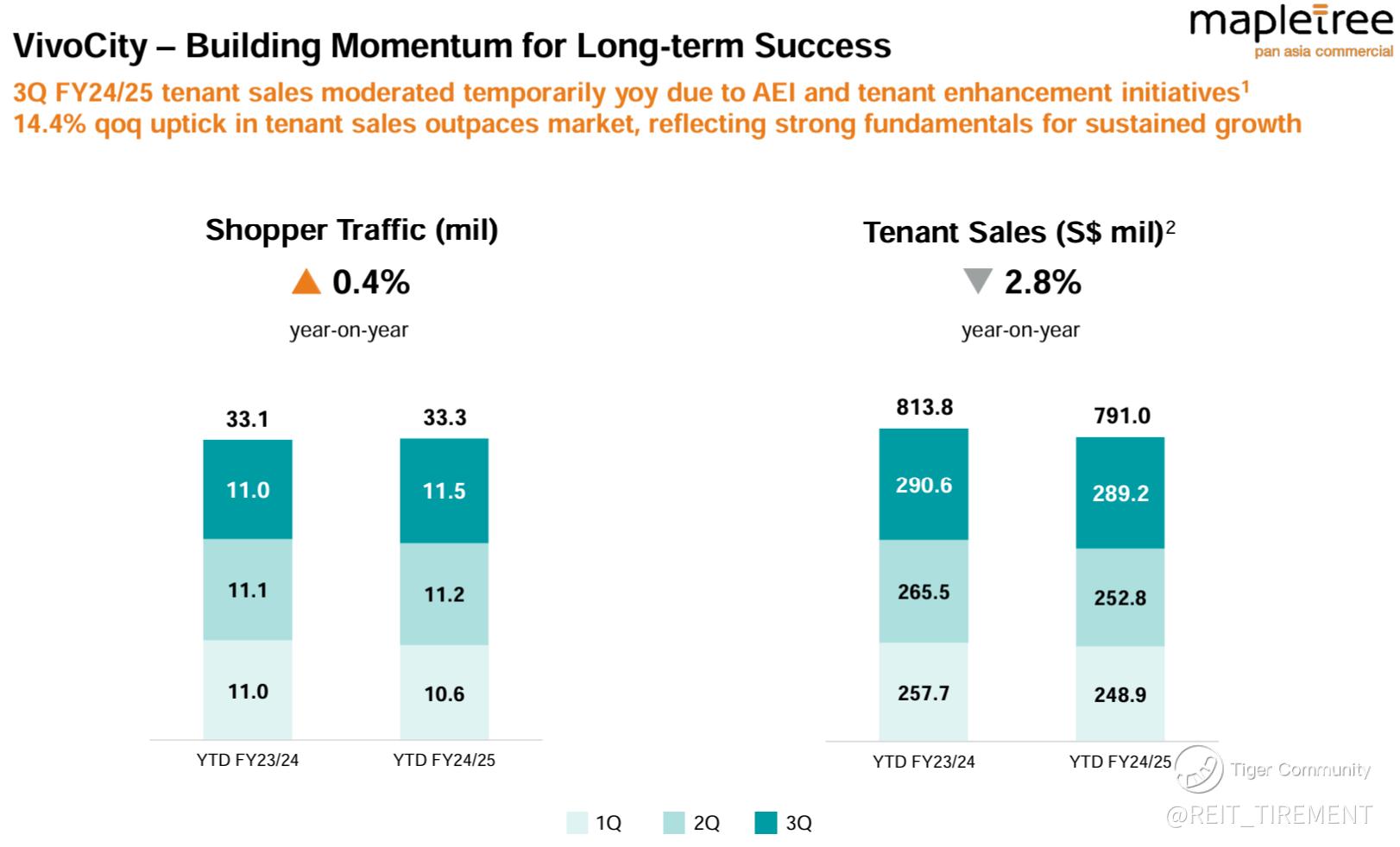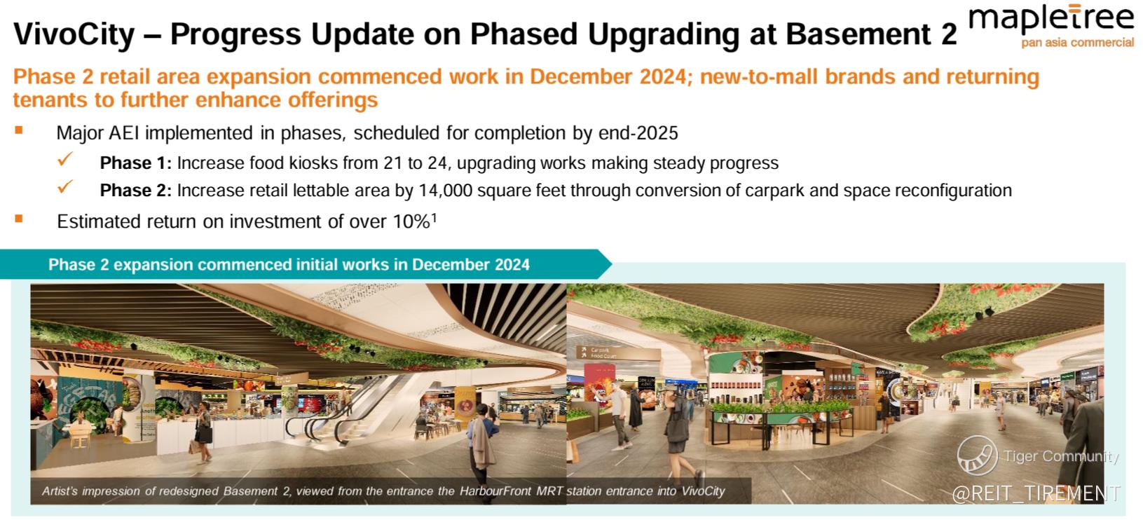 The AEI at VivoCity’s basement 2 is progressing as planned. Phase 1 has added three new food kiosks, and Phase 2 is set to expand retail space by 14,000 square feet. Completion of the entire project is targeted for the end of 2025, enhancing the mall’s offerings and long-term income potential.