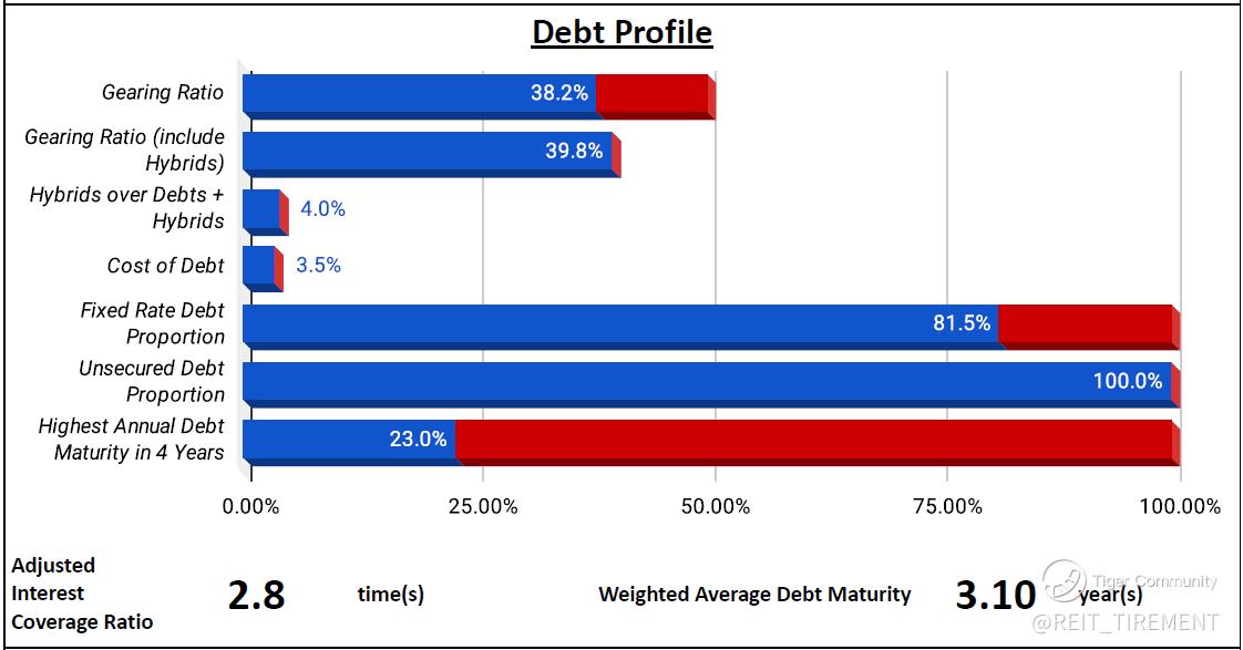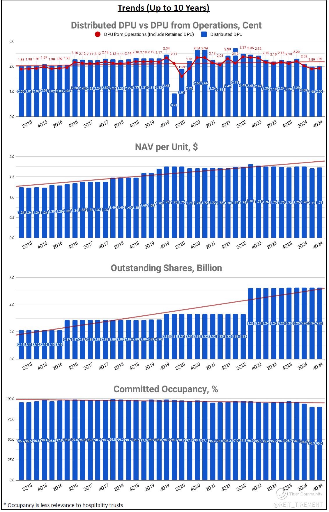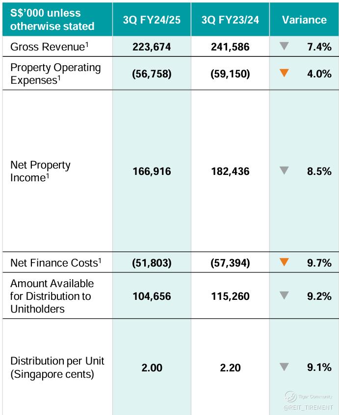 Despite the divestment of Mapletree Anson, MPACT’s gross revenue, NPI, and DPU remain stable, supported by Singapore’s resilient performance. On the debt front, only 4% matures this fiscal year, with 15% due in the next fiscal year.
