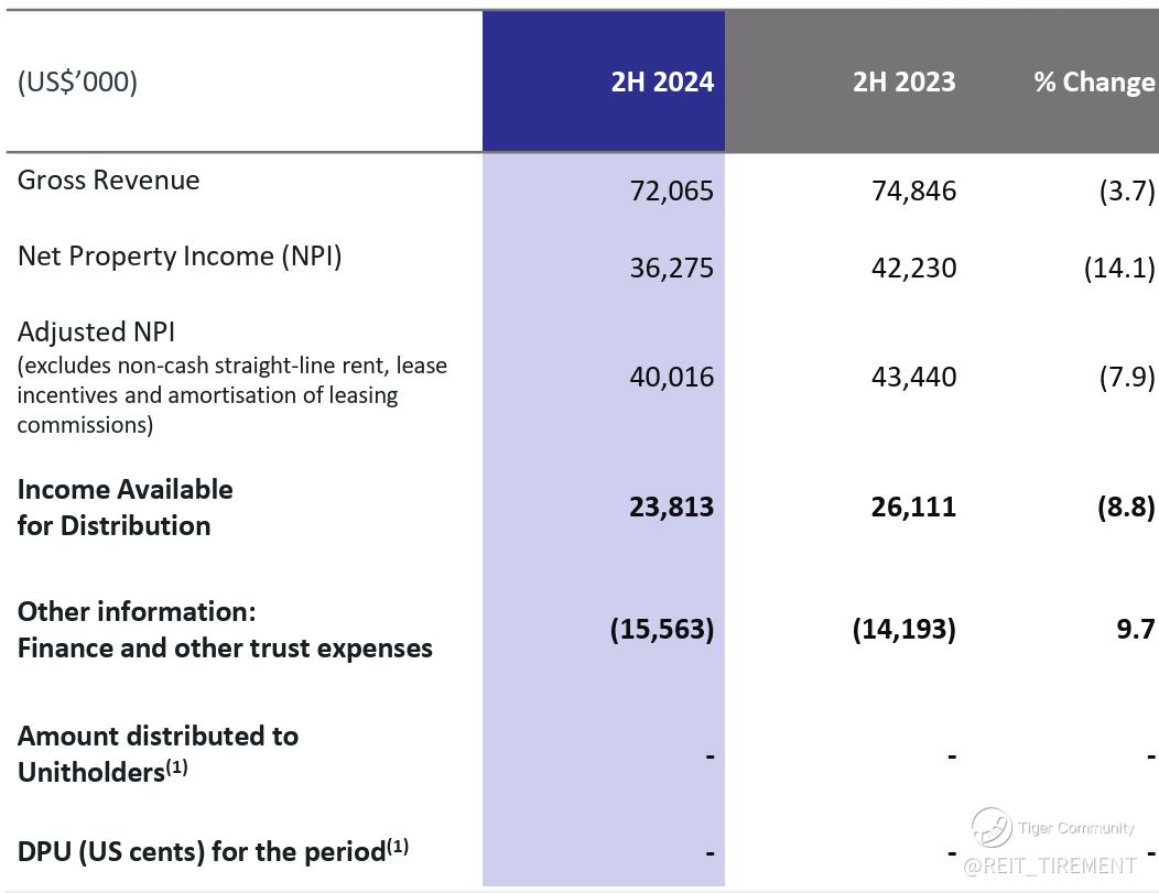Gross revenue for 2H 2024 declined YoY, mainly due to lower non-cash rental income, higher vacancies, and reduced one-off termination fees, partially offset by higher recoveries income. Increased property expenses from maintenance, management fees, and leasing costs led to a 14.1% drop in NPI (7.9% lower after adjusting for non-cash items). Coupled with higher finance costs, income available for distribution also declined.