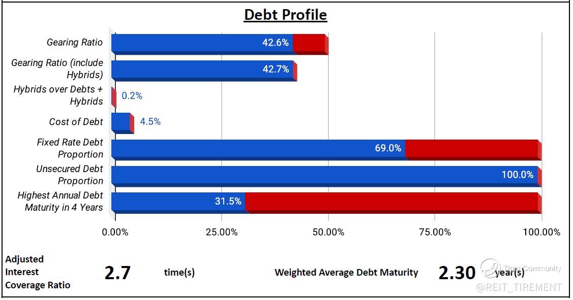 Compared to the previous half-year, gross revenue and NPI have declined, but income available for distribution remains stable. On the debt front, 9.7% is set to mature in 4Q 2025.