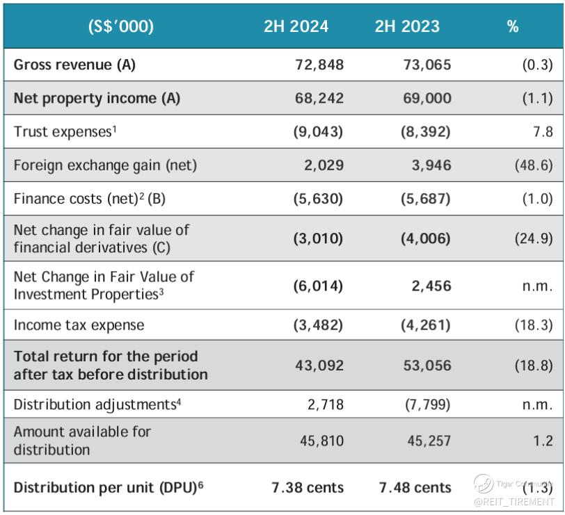 PLife REIT’s performance remains stable compared to the previous half-year. The slight dip in DPU is due to an enlarged unitholder base following the equity fundraising for the French acquisition. On the debt front, only 2% of total borrowings will mature in 2025.