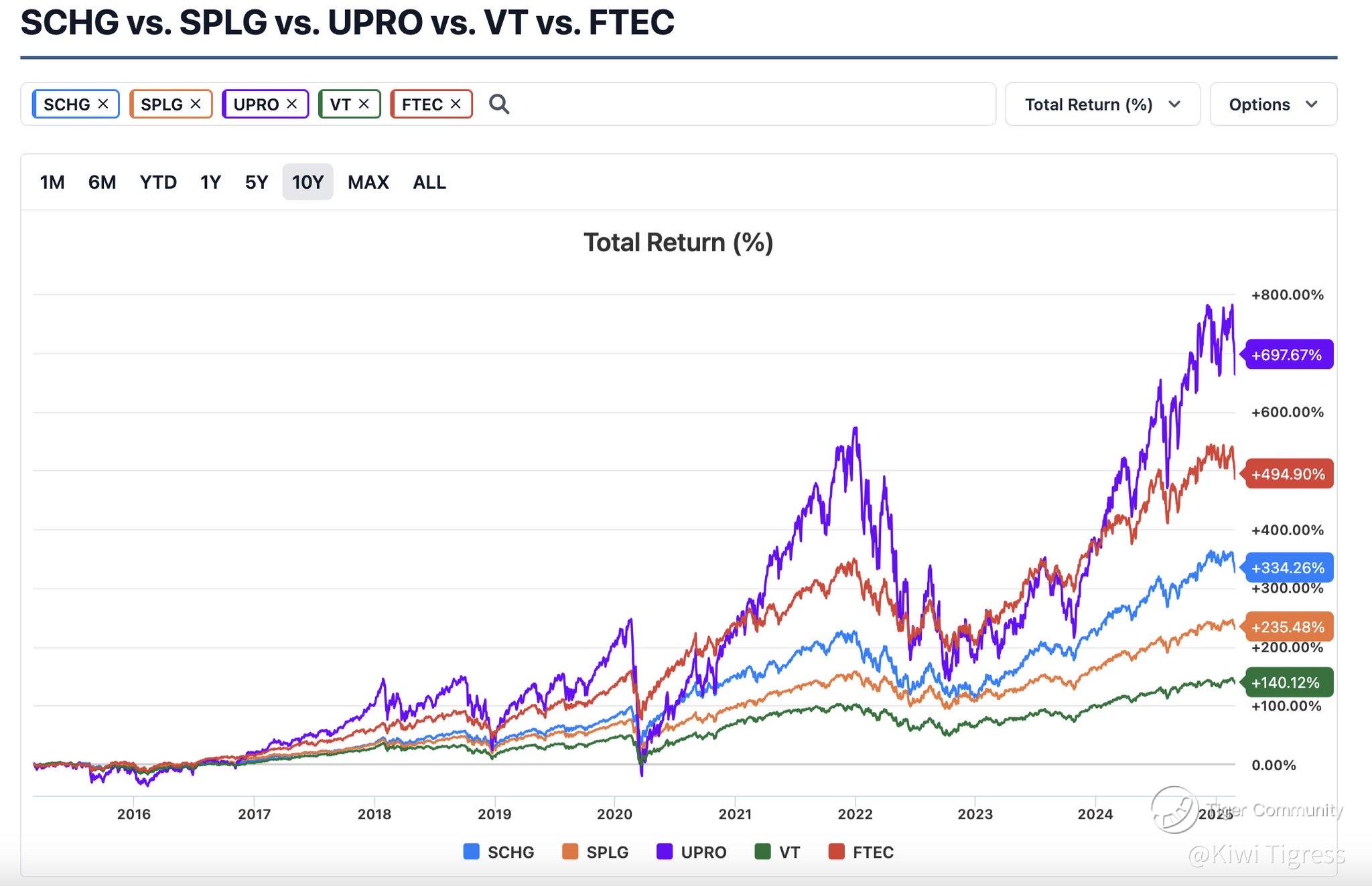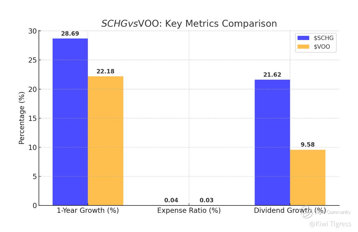 π The $SCHG Lowdown: This beast (Schwab U.S. Large-Cap Growth ETF) tracks the Dow Jones U.S. Large-Cap Growth Total Stock Market Index, think big dogs like Apple (12.5%), Microsoft (11.8%), and Nvidia (5.2%). Itβs all about tech, healthcare, and consumer plays crushing it. Past year? Up 28.69%, while $VOOβs chilling at 22.18%. $VOOβs got that steady S&P 500 vibe, but $SCHGβs got the sauce, AI, cloud computing, semiconductors, the future, fam! π Oh, and the expense ratio? A tiny 0.04%, more dough stays in my pocket. π€